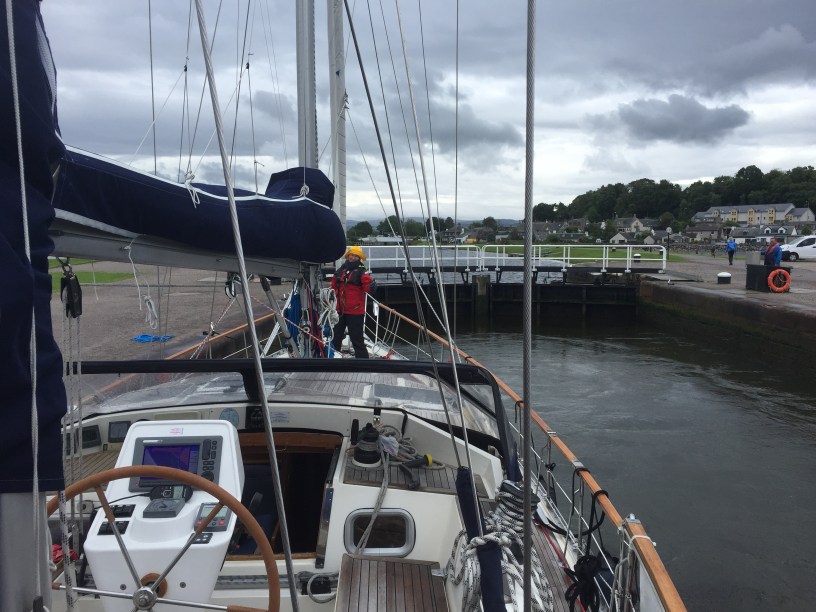 IMG_2630[1]Sista biten hade vi 3-4 knop medström och vattnet virvlade och kokade runt oss. Inget man vill ta sig an i motström! Självfallet regnade det också …. På vägen in till Inverness tappade vi en fender i sjön, självfallet där det var (med-) strömt och virvligt värre. Flera varv runt och till sist var denna återinfångad, därefter en stunds snurrande utanför Caledonian Canals inlopps-sluss. Slussvakten David är hur trevlig som helst och efter en stund slussade vi in, betalade för oss (exakt 12,98 x 20,10 £, TuSan’s mätbrev gällde!) och kom sedan till Seaport Marina, första gästhamnen i Caledonian Canal. Vi ser fram emot en natt utan tidvattens-relaterade störningar!