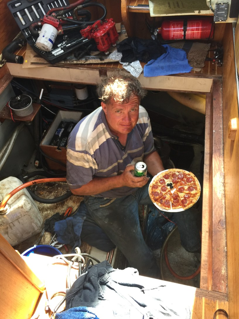 Christophe och Pascal har slitit hårt med att ta ut både generatorn och motorn. Vi fick ta loss diverse delar av motorn för att kunna få ut den ur motorrummet men nu är den ute. I helgen tillbringade jag 9 timmar (!) med att rengöra motorrummet ordentligt, det hade nog inte gjorts på 30 år sedan båten byggdes – mest för att motorn ju faktiskt är i vägen för att komma åt under motorn.