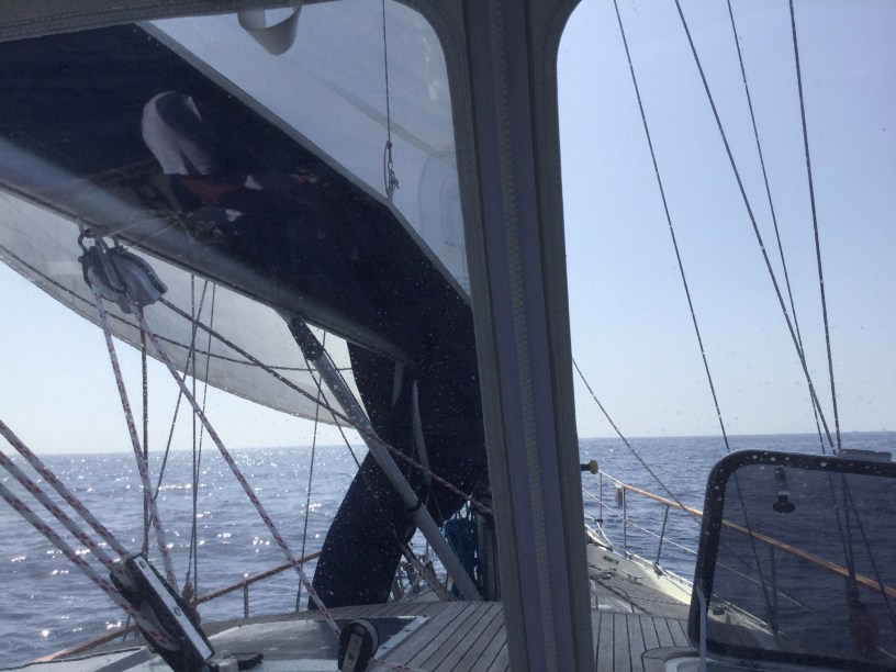 Idag, torsdag 12 juli vaknar vi till svaga vindar och återigen sol, sol, sol. Vi ser nu att vattnet är helt transparent och att botten består av vackert sjögräs. Solpanelerna hade strulat (bara levererat 5 Volt fast de ska leverera ca 30 Volt, sedan sköter laddregulatorn resten) så det var dags att plocka fram voltmätaren och kolla alla kopplingar för att se var felet var någonstans. Det visade sig att Colin hade skruvat en riggdetalj för fockens rullsystem så att elkabeln från solcellen hade kommit i kläm … lätt att fixa med en bit utbytt kabel. Här nu litet reklam: Att ha ett batteriövervakningssystem (vi har en Victron BMS 702) och en laddregulator (Victron MPPT 100/30) som kopplar upp sig till ipad via Bluetooth är fantastiskt. Jag såg att solcellen levererade bara 5V och då var det ju dags att hitta felet – utan dessa prylar hade vi inte vetat att solcellerna hade lagt av.