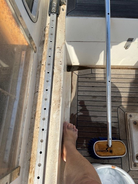 Päivi har tvättat TuSan utombords och hon var ordentlig smutsig – inte bara Saharasand utan även Etna-aska hade gjort sitt så det var ett digert jobb.