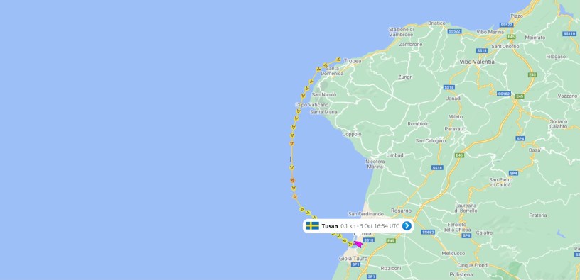 Jolle-problemet löser sig självt i och med att dess tamp slits av. Jollen är borta och det finns ingen chans att göra något åt det nu. Vi tar kurs på Gioia Tauro, en industri-containerhamn som ligger 6 sjömil bort. Med den fart vi nu har är vi där på 45 minuter. Sjön gick så hårt att autopiloten inte hann/orkade med utan Ott fick handstyra i halv storm.