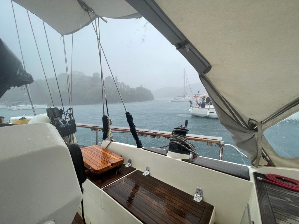 Plötsligt kommer en störtskur med starka vindar och alla båtar i viken dansar omkring åt alla håll. Vi kommer mycket nära en annan båt och behöver därför ankra om. Ingen tid att ta på sig regnkläder utan det var bara att stå ute i det svala hällregnet och fixa. Det kom nog 50 mm på mindre än en timme …. Vi var dyblöta och rätt frusna, men som tur inträffade detta på dagtid med rätt god sikt trots allt.