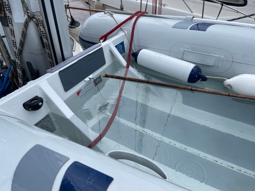 I natt kom regnet och åskan. Ordentligt. Buster (vår Cairn Terrier) hade högljudda åsikter om att himlen morrade högre än han själv. Det blåste mellan 10-16 meter per sekund (alltså 20-32 knop) och regnade otroligt mycket. Vår jolle, som ligger på däck med kölen nedåt, var fylld med vatten till ca. 30 cm!