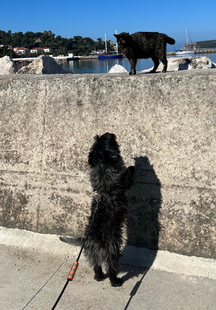 Det blåste envetet rakt i käften på oss och gick ganska hög sjö, så vi hade ingen lust att kryssa. Det blev motorgång i hög sjö runt fastlands-Europas näst sydligaste udde (Gibraltar är #1) till en liten by, Porto Kagio, där vi var enda båten i viken, även här för ankar då den lokala kajen är för grund för oss. Promenad iland med Buster och middag på den lokala restaurangen, för en gångs skull ganska snåla portioner.