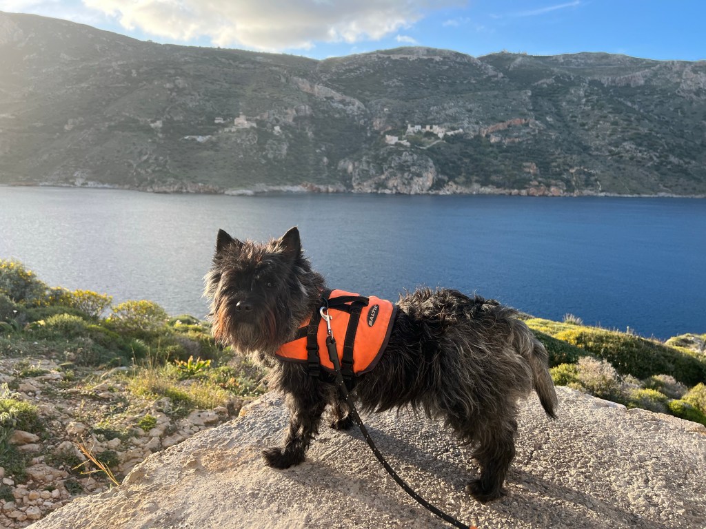 Lugn natt och morgonpromenad med Buster. I viken ser vi en säl som dyker upp då och då, det finns ’Munk-sälar’ i Medelhavet lärde vi oss i höstas.