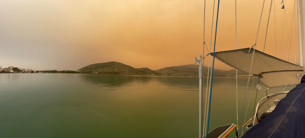 Eftersom detta är Grekland så ändras vindförhållanden självfallet utan förvarning. På mindre än två minuter går det från 2 meter per sekund (4 knop) till 12 meter per sekund – 24 knop! Ut med revad Genua (segel) och stopp på motorn för nu seglar vi.