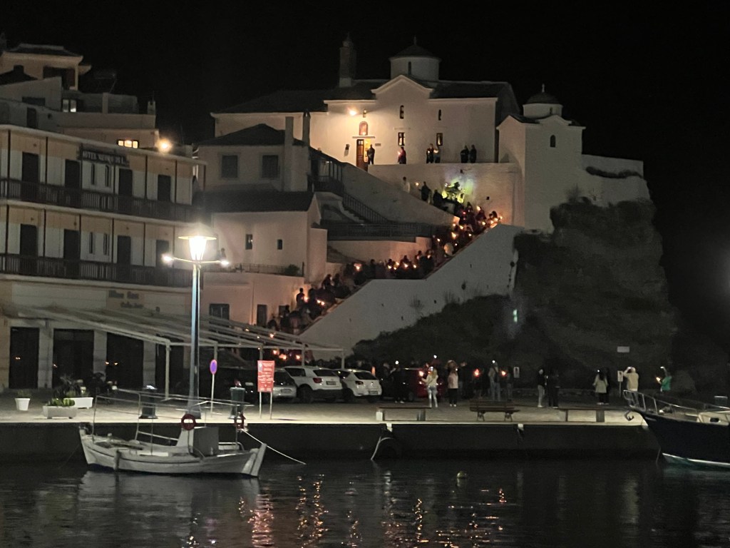 Grekerna är i huvudsak grek-ortodoxa och följer därmed den julianska kalendern (alltså inte den gregorianska kalendern som de flesta andra kristna kyrkorna följer). I år inträffade deras påsk i början av maj och vi fick uppleva den på plats i Skopelos.