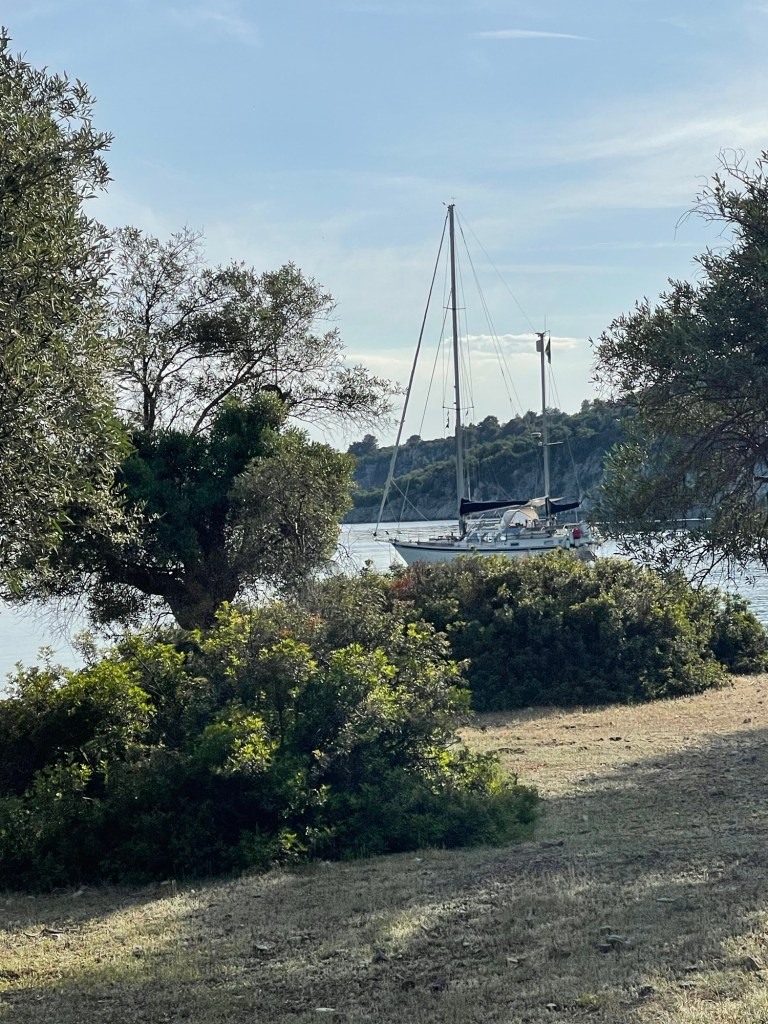 Färden fortsatte mot ön Alonissos där vi låg på två olika ställen. Första natten för ankare i en liten vik som användes som utskeppningshamn för vin-amforor i antiken. Det låg tusentals tegel-färgade skärvor på marken och en skylt upplyste om historien. Intressant.